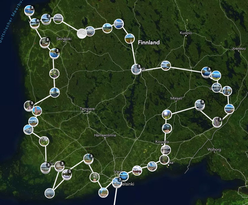 Helsinki | Espoo | Otaniemi Aalto Universität – Espoo | Otaniemi | Soukanranta | Kirkkonummi Porkkulan | Lohja | Somerniemi | Liesjärvi NP | Salo | Teijo National Park | Kasnäs | Paimio | Paimio Sanatoriom – Paimio |Turku | Ruissalo | Härkluoma | Rauma |Pinkjärvi Beach | Pori | Pori Strand | Yyterin Strand | Niinisalo | Kauhaneva-Pohjakangas-Nationalpark | Kurikka Pitkämö Beach | Kurikka Tullumäen louhos | Levaneva Nature Reservat | Levaneva NP |Vaasa | Vaasa | Fjärdskär | Svedjehamn | Björkoby Hafen | Vaasa | Maxmo Badestelle | Maxmo Meer | Komossa | Alajärvi | Kyyjärvi | Peltokangas | Pyhä-Häkki National Park | Puuppola | Jyväskylä | Paltanen | Varkaus | Oravi | Enonkoski | Savonlinna | Kruunupuisto | Simpele | Neitsytniemi | Kirche der drei Kreuze – Alvar Aalto | Puumala | Saimaa | Kirjoniemi | Mäntyharju | Repovesi Nationalpark | Myllykoski | Valkmusa Nationalpark | Loviisa | Porvoo | Sipoonkorpi Nationalpark | Helsinki