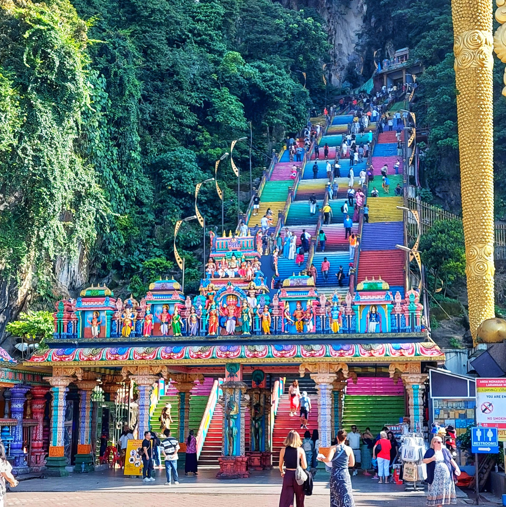 Die Batu Caves liegen etwas ausserhalb und sind mit einem Zug oder dem Grab zu erreichen. Die Anlage umfasst einige Tempel, Stände und Restaurants. Der Ort ist touristisch intensiv genutzt. Es lohnt sich dennoch, sich das anzusehen auch wenn man nicht zu viel erwarten sollte. Wer jedoch Ende Januar / Anfangs Februar zum grossen Hindu Thaipusam- Fest da ist, erlebt sicher ein ganz besonderes Spektakel. Wir empfehlen morgens da hin zu gehen. Dann liegen die 272 steile Treppenstufen im Schatten und es hat etwas weniger Besucher.