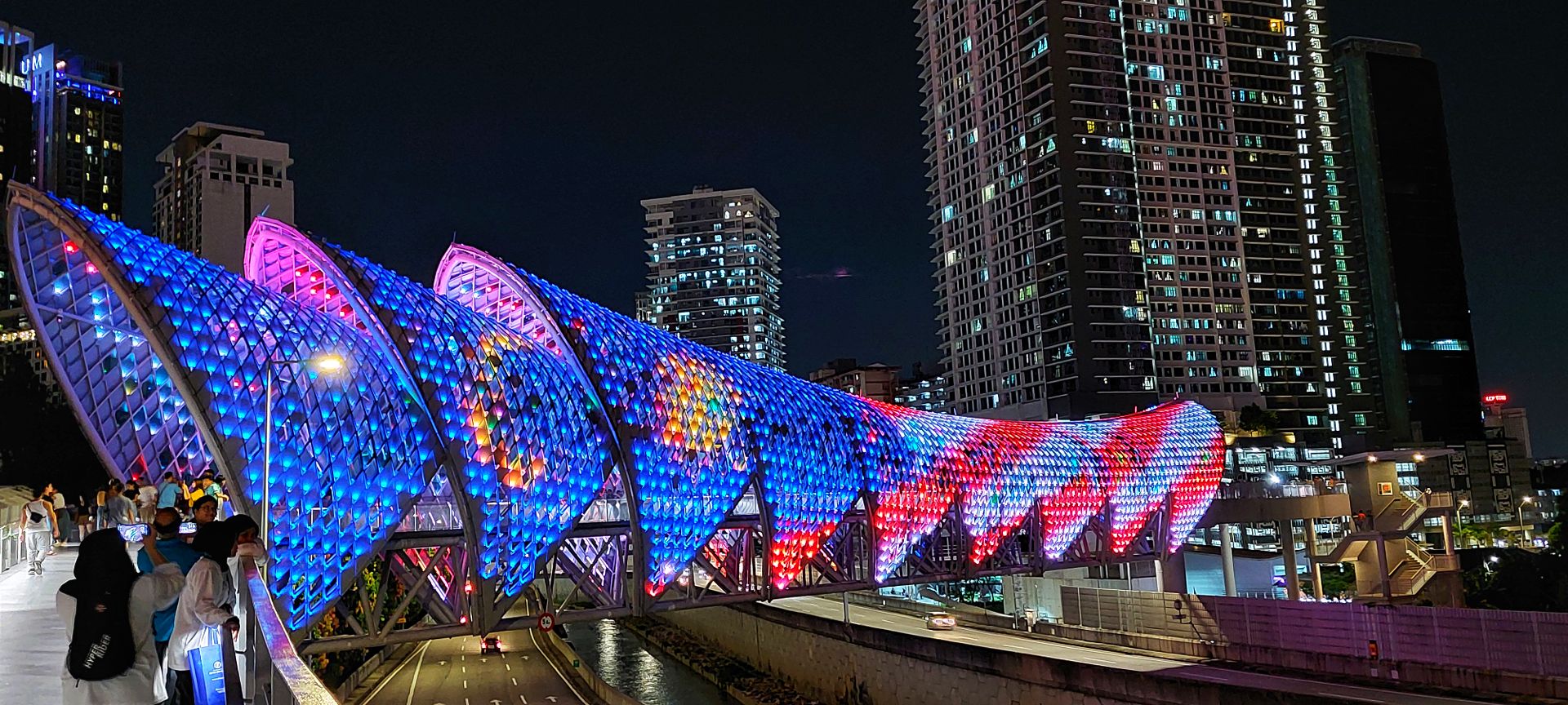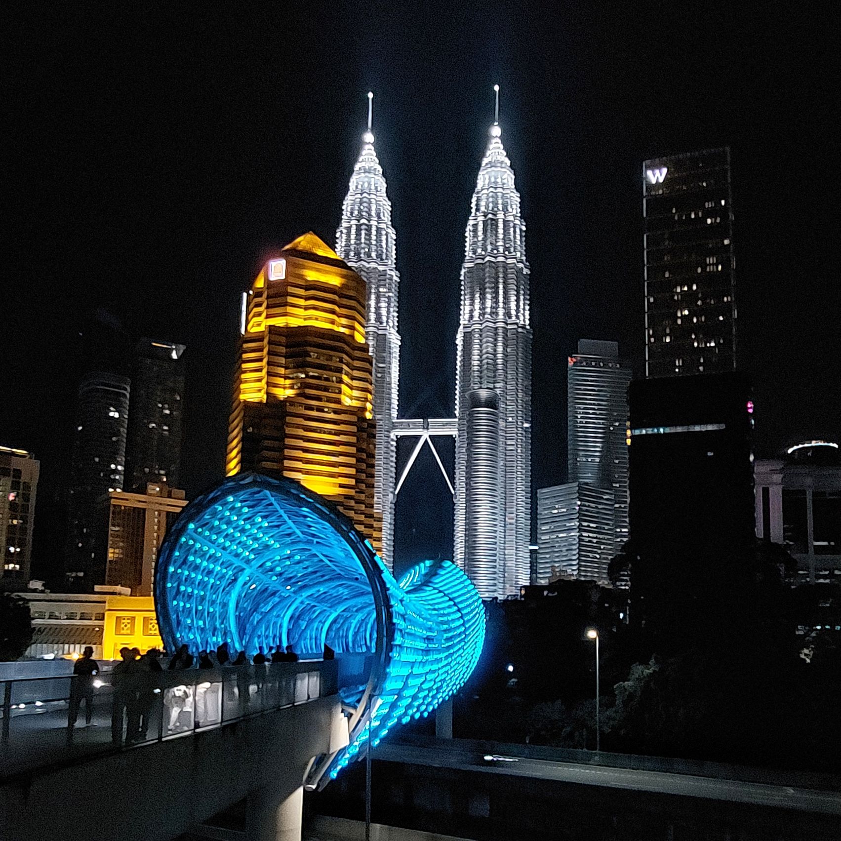 Das ist eine hübsch beleuchtete Fussgängerbrücke über die Stadtschnellstrasse. Da es in der Nähe der Petronas und eines Lieblingsrestaurants ist, ein kurzer Nachtspaziergang wert.