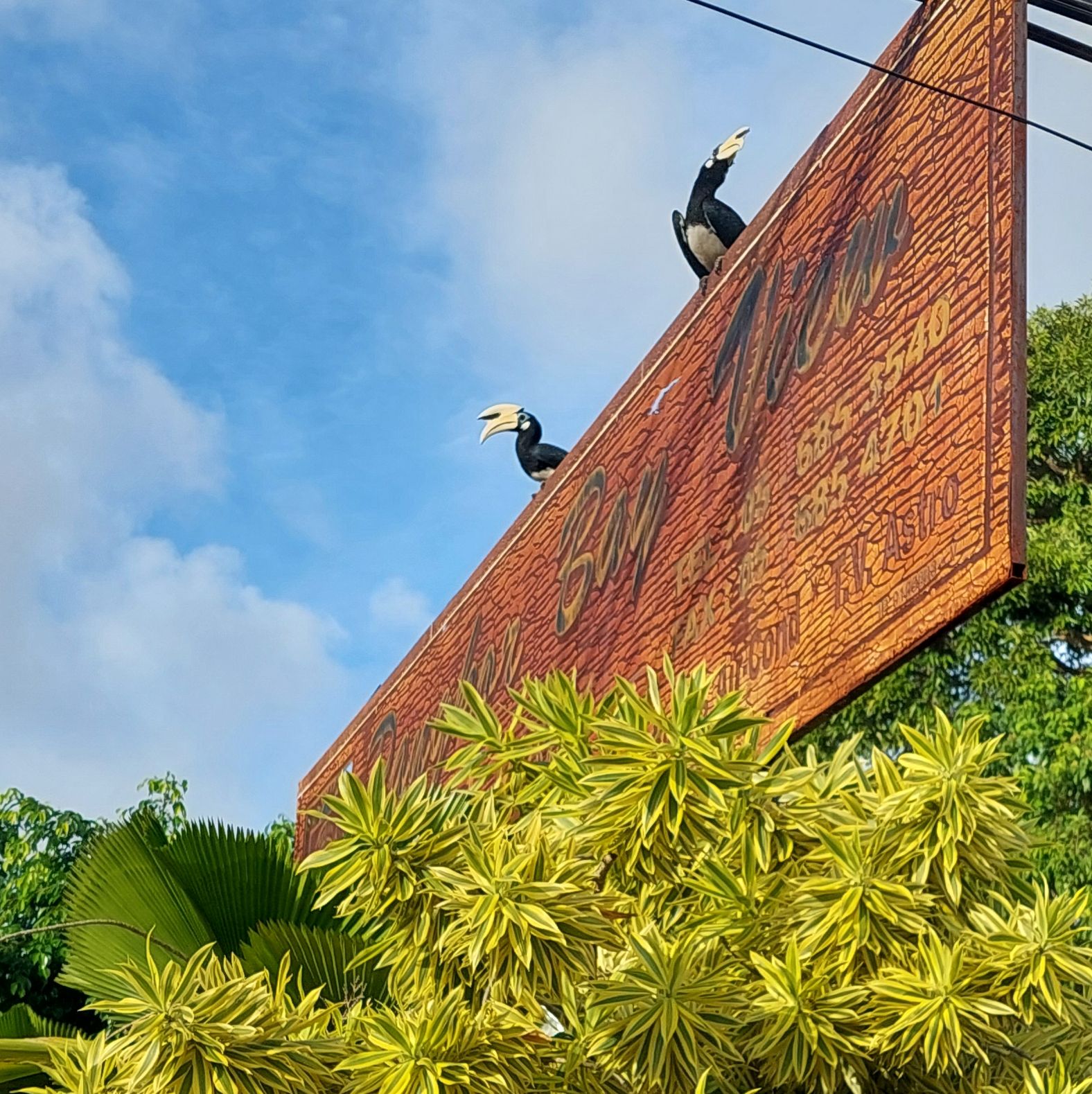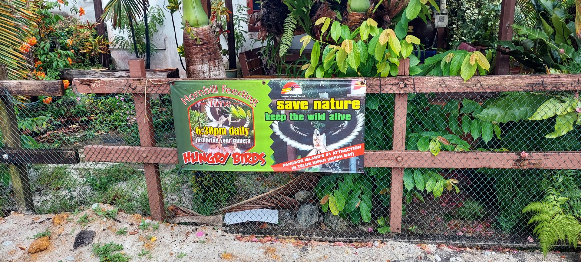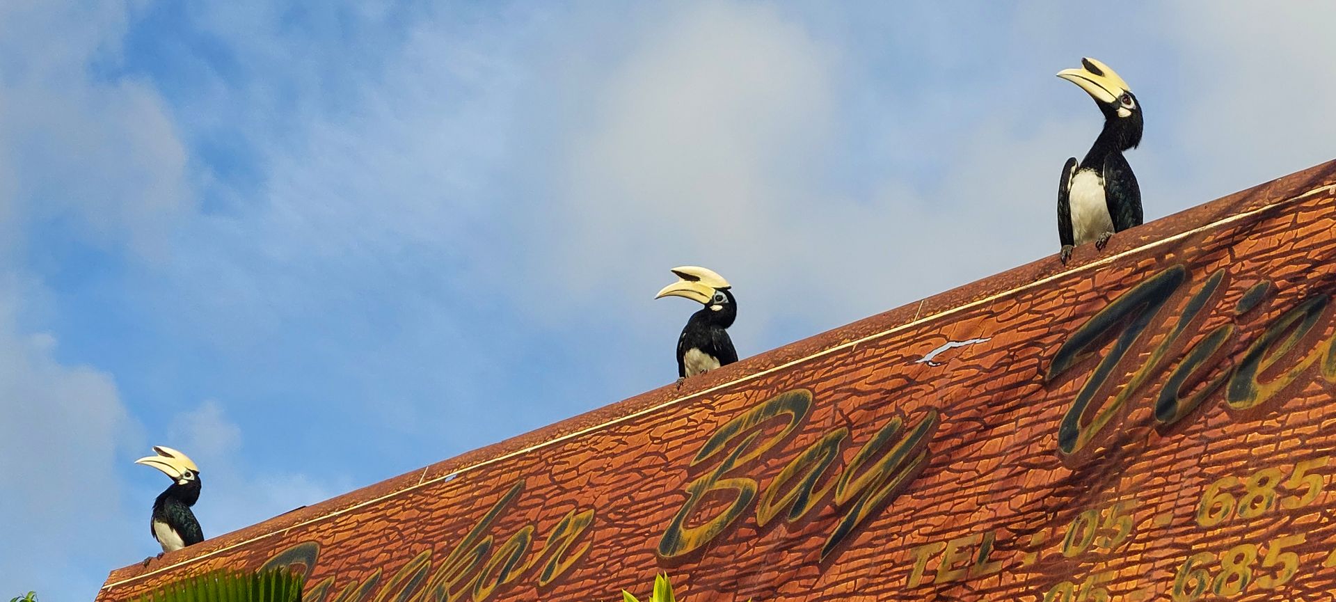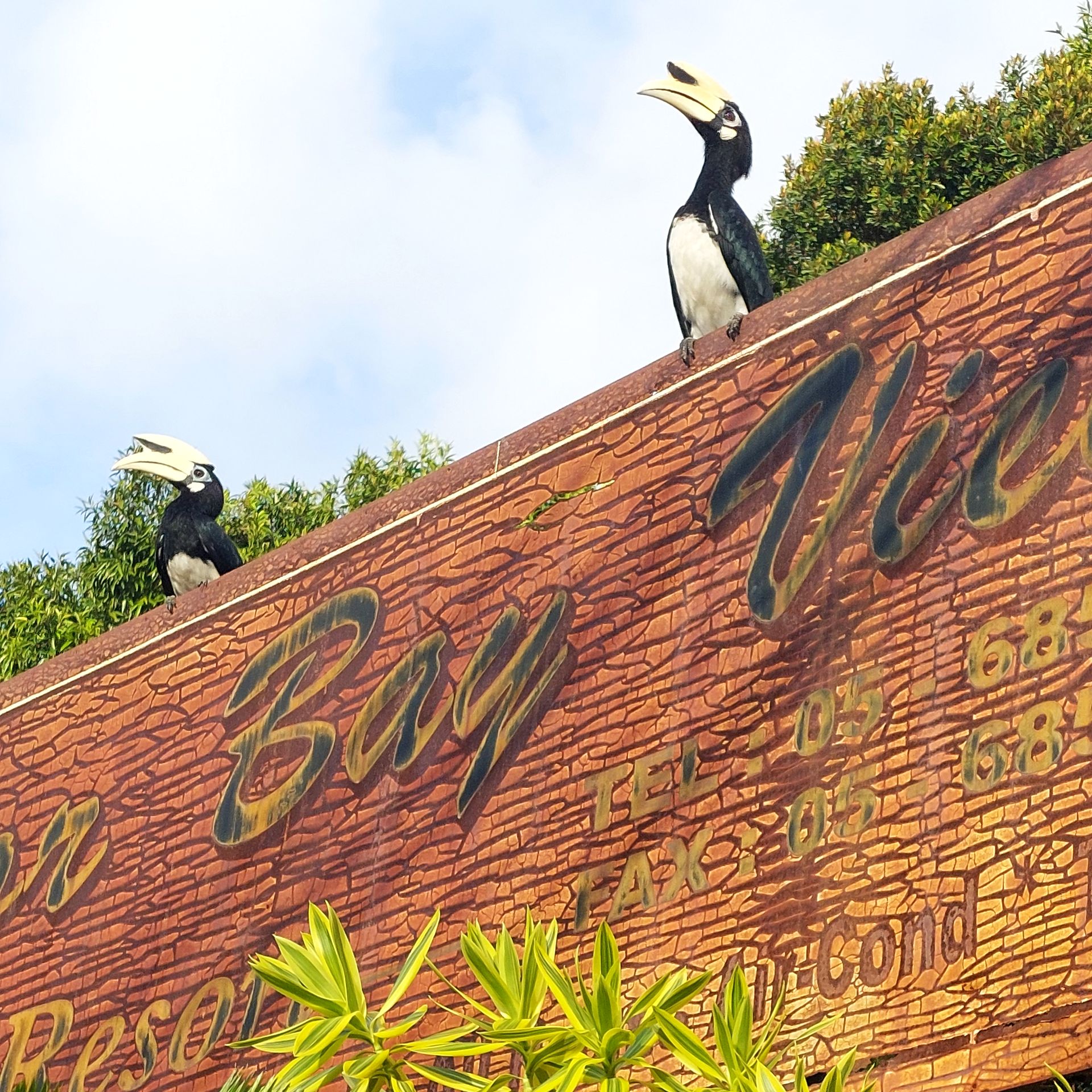 Gleich in der Nähe unserer Unterkunft wurden jeden Abend Hornbills gefüttert und man konnte mit Futter in der Hand Fotos machen. Das war nicht so unser Ding. Davor warteten die Vögel vor unserer Unterkunft und das war toll mitanzusehen. Und auch im Nipah Deli kamen sie hin und wieder vorbei und bekamen auch eher beiläufig was zu fressen. Wie wenn Nachbars Katze einen kleinen Snack kriegt ohne was Besonderes zu tun.