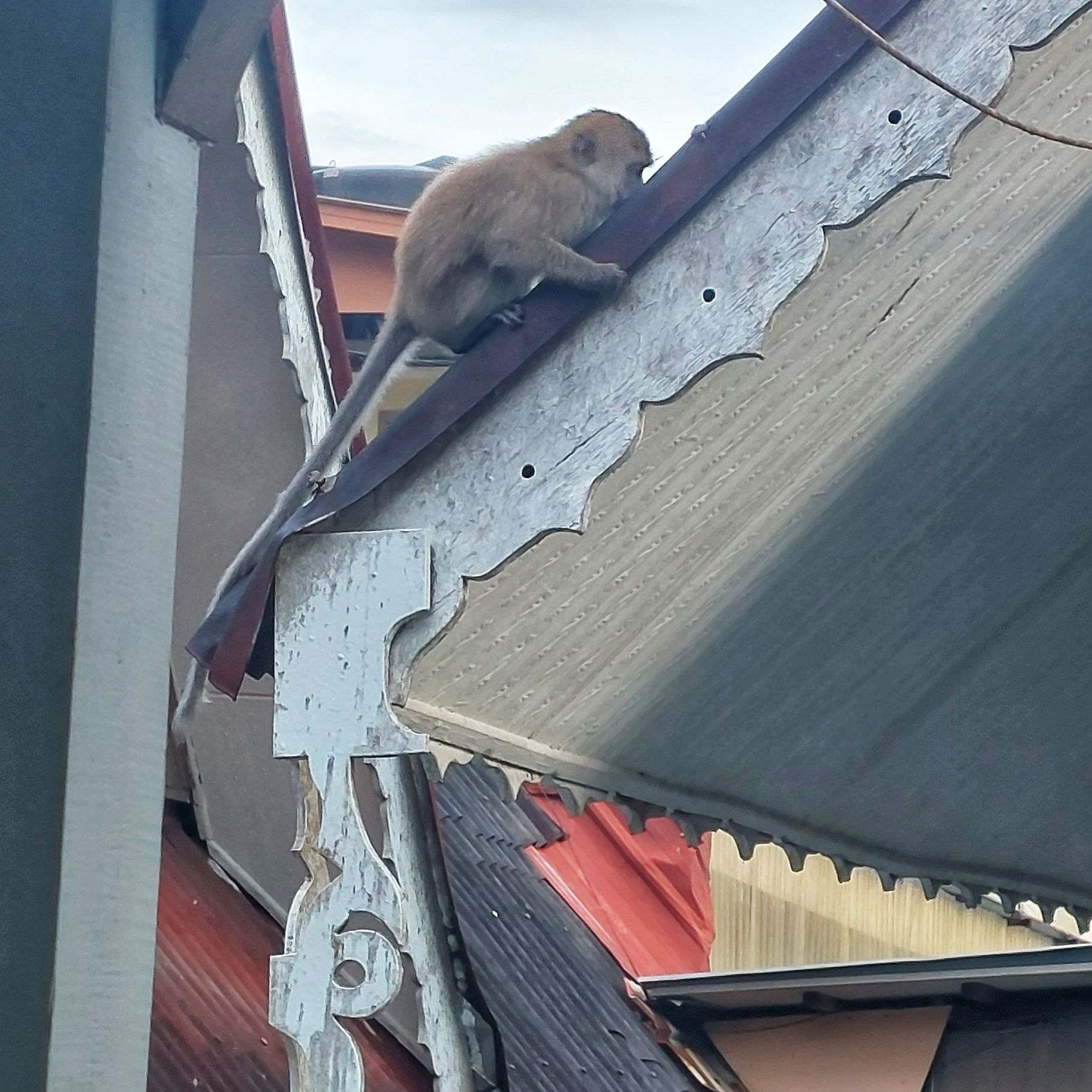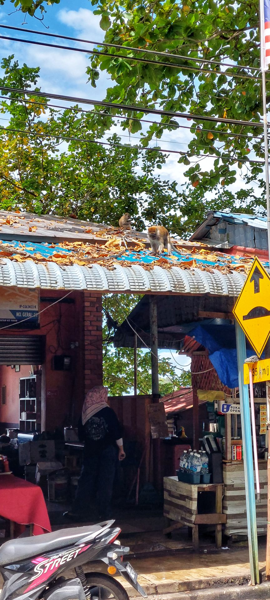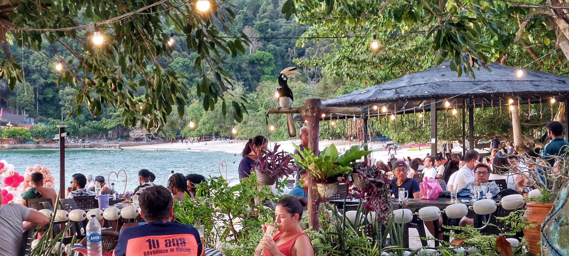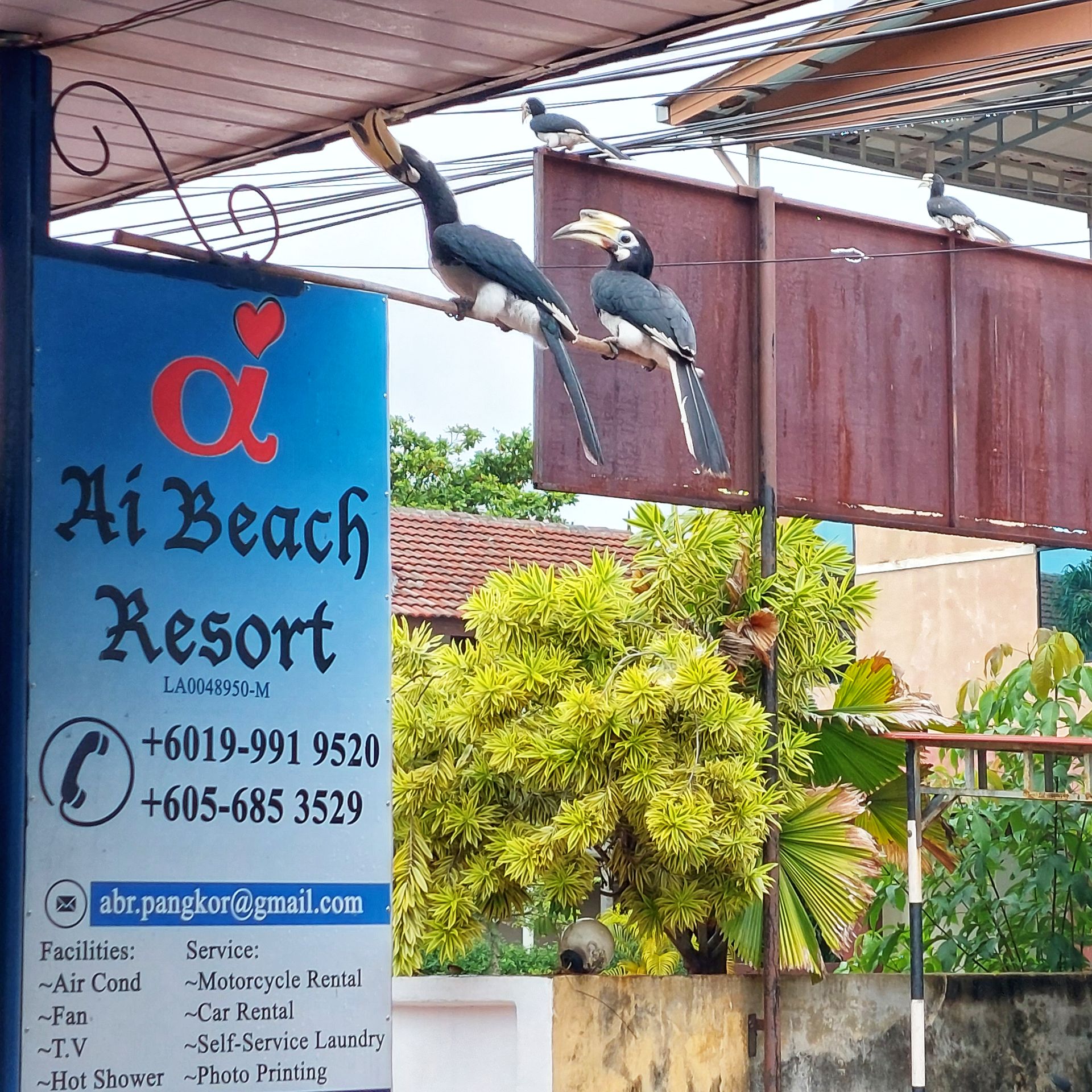 Gleich in der Nähe unserer Unterkunft wurden jeden Abend Hornbills gefüttert und man konnte mit Futter in der Hand Fotos machen. Das war nicht so unser Ding. Davor warteten die Vögel vor unserer Unterkunft und das war toll mitanzusehen. Und auch im Nipah Deli kamen sie hin und wieder vorbei und bekamen auch eher beiläufig was zu fressen. Wie wenn Nachbars Katze einen kleinen Snack kriegt ohne was Besonderes zu tun.