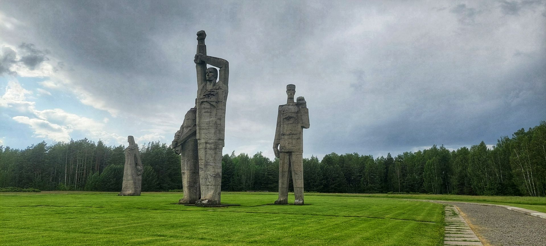 Sieben etwa 17m hohe Skulpturen, die das Leid, die Zähheit und den Erfolg des Antifaschismus im Kampf gegen das NS-Regime verkörpern sollen, stehen auf einer grossen Wiese dahinter.