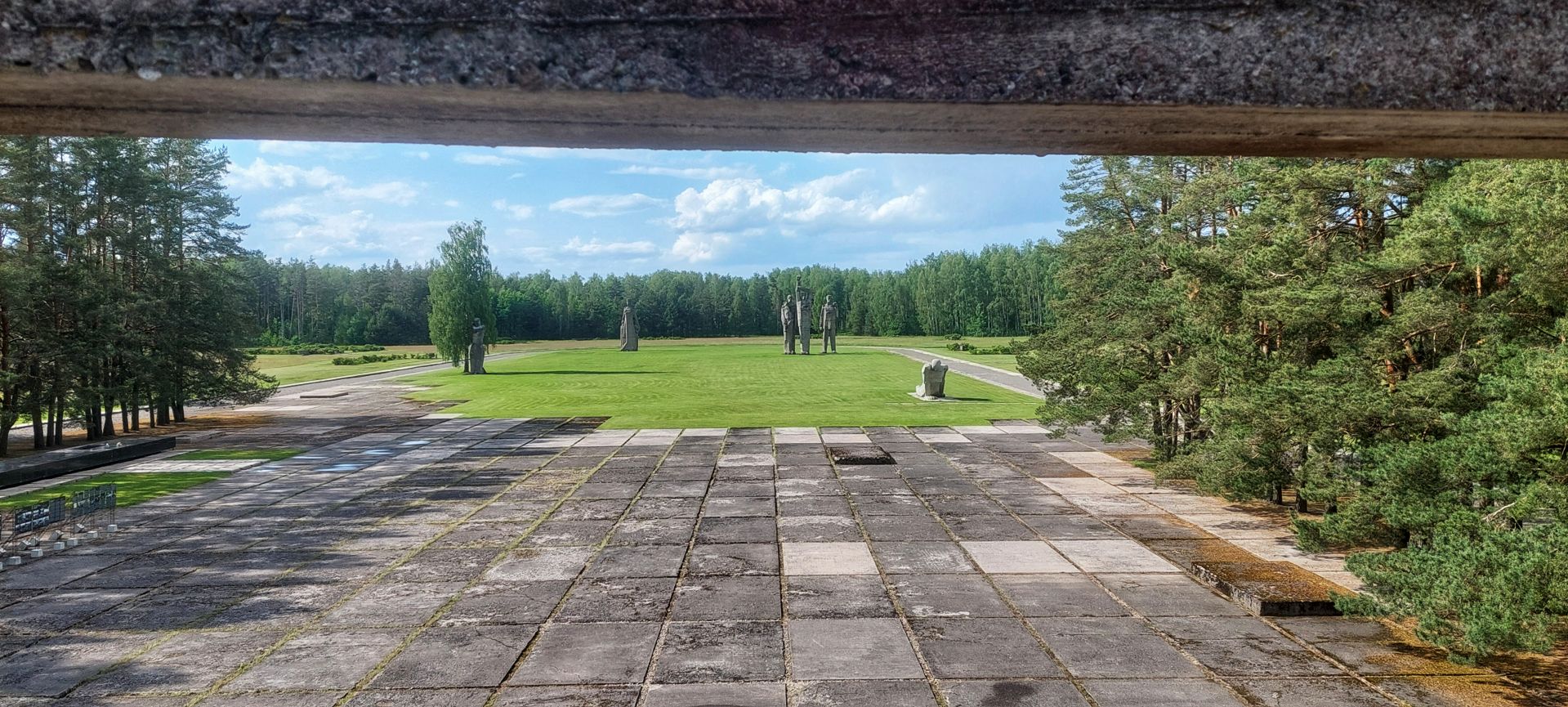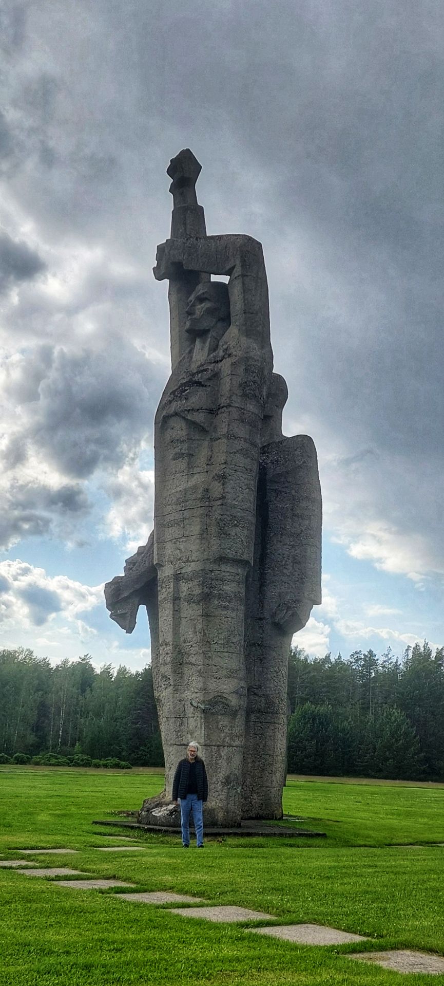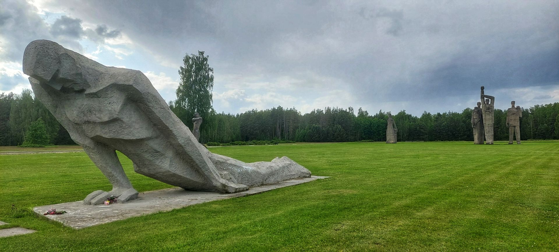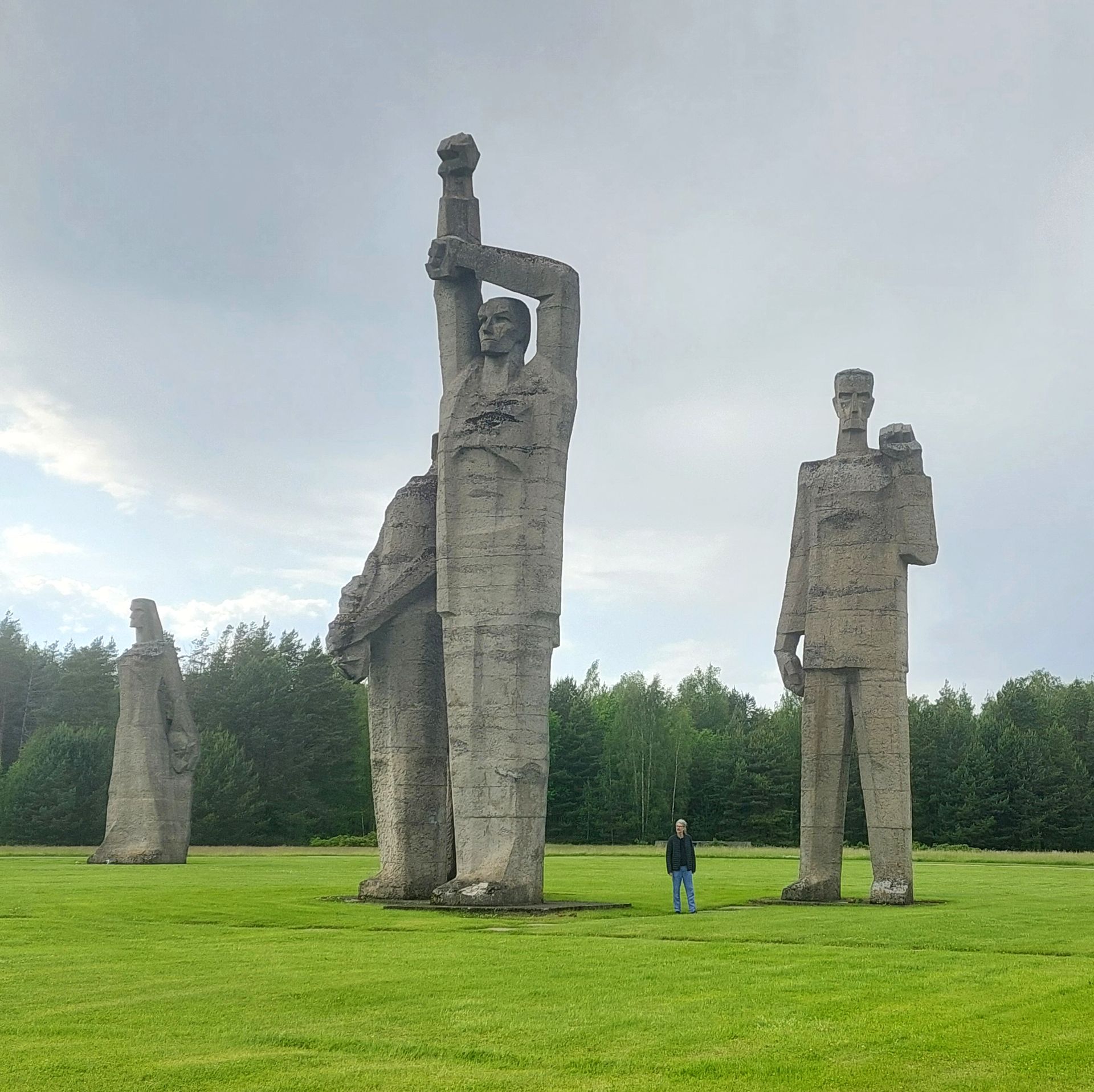Sieben etwa 17m hohe Skulpturen, die das Leid, die Zähheit und den Erfolg des Antifaschismus im Kampf gegen das NS-Regime verkörpern sollen, stehen auf einer grossen Wiese dahinter.