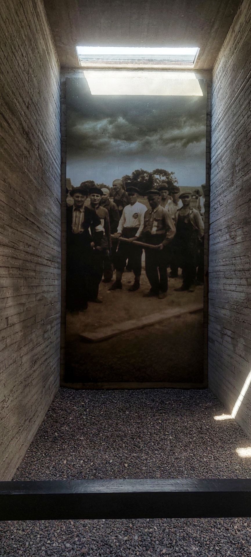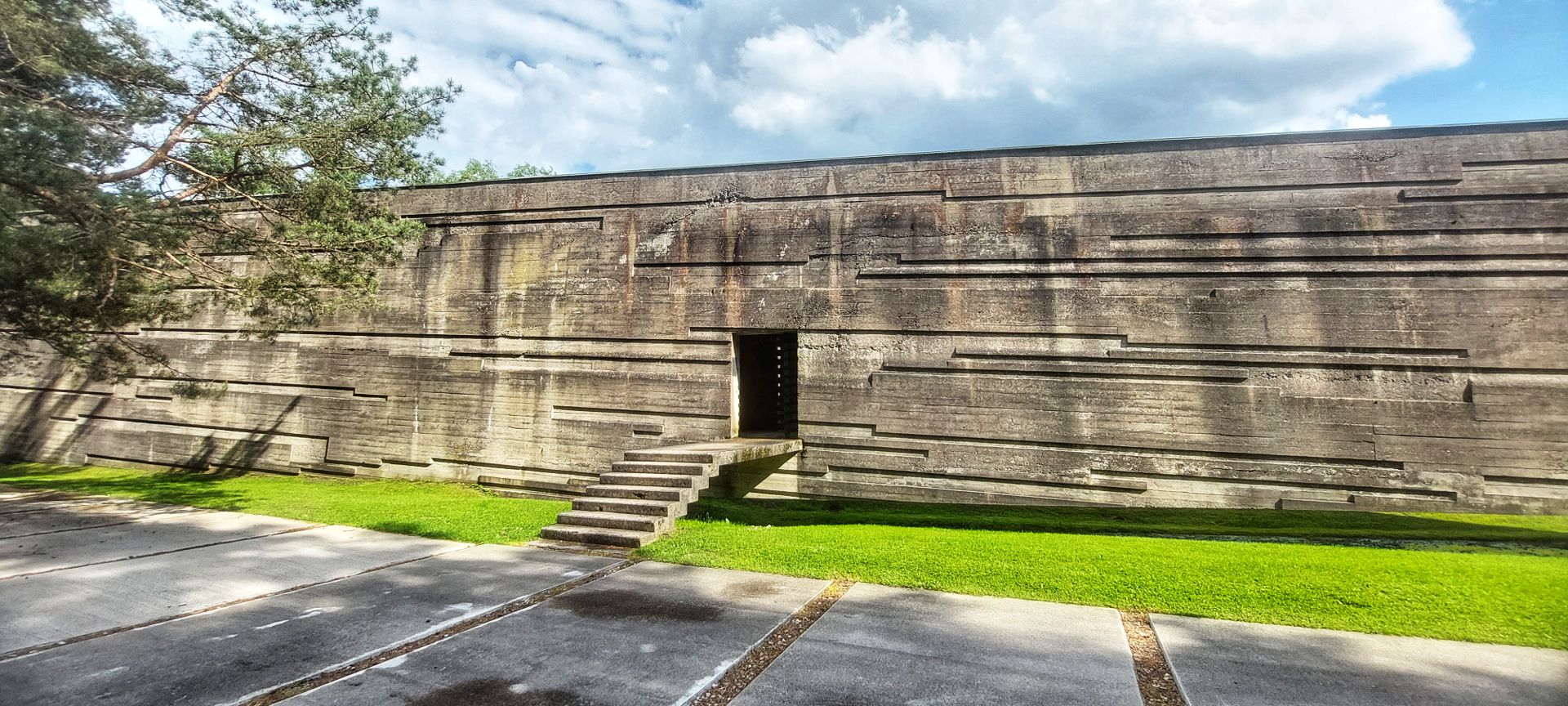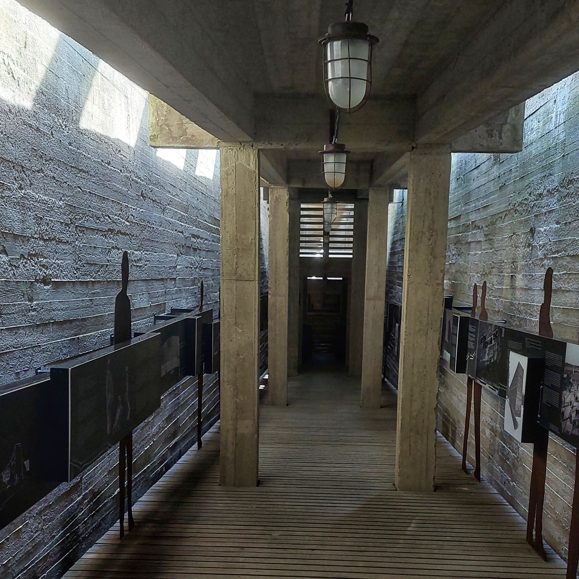 Wenn man vom Parkplatz zum Gelände geht, läuft man erst zu einem riesigen, teilweise schwebenden „Balken“, in welchem sich das Museum befindet. Verschiedene Ebenen und Ausblicke, inszeniert durch ein besonderes Lichtspiel, zeigen hervorragende Architektur damaliger Zeit.