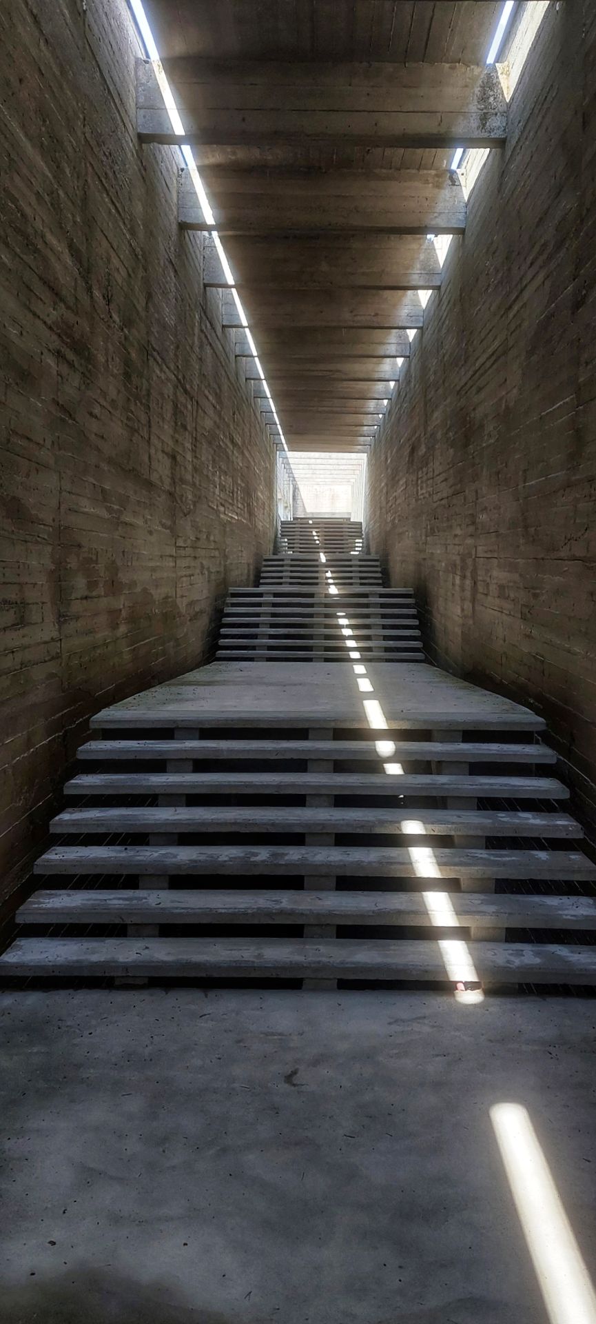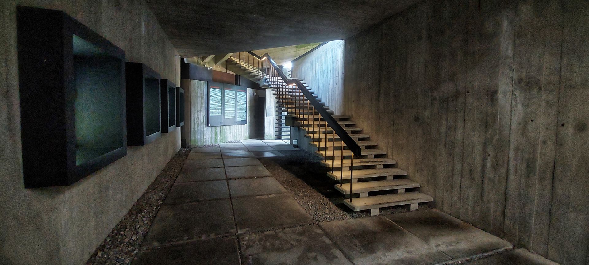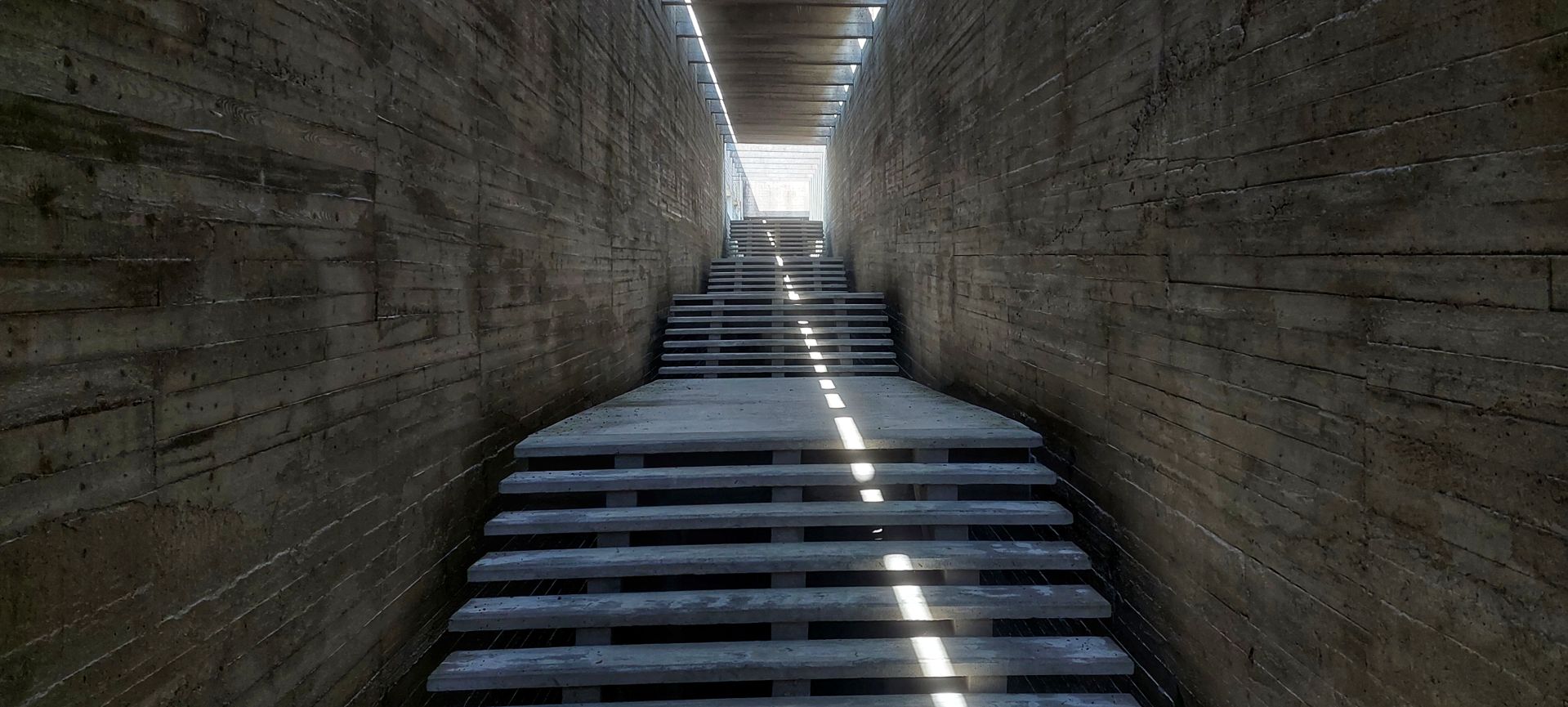 Wenn man vom Parkplatz zum Gelände geht, läuft man erst zu einem riesigen, teilweise schwebenden „Balken“, in welchem sich das Museum befindet. Verschiedene Ebenen und Ausblicke, inszeniert durch ein besonderes Lichtspiel, zeigen hervorragende Architektur damaliger Zeit.