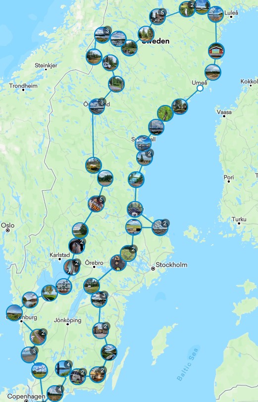 Bara | Södra Rörum Brohusvägen | Frostavallen | Kristianstad | Önnestad | Lönsboda |Älmhult | Ljungby | Kyrkö Mosse Autofriedhof | Tingsryd | Vissefyärda | Alsjöholm | Finsjö | Vimmerby | Norra Kvill | Linköping | Vreta | Bergen | Ljungsbro | Samsala | Kvicksund | Anundshög | Lådö | Hedesunda | Öregrund | Kallriga | Gävle | Heda | Hedsjön | Mellanfjärden | Nora | Sundsvall | Högakustenbron | Skuleskogens Nationalpark | Husum | Umeå | Granberget | Ursviken | Pålsträsk | Storforsen | Grodkällan Frogs Spring | Auksjauer | Slagnäs | Gimegolt Nationalpark | Sorsele | Norrsele | Norr-Svergoträsket | Storuman | Nästansjö | Trappstegsforsen | Lövberg | Stekkenjokk |Andvattnet | Risnäs | Lidsjöberg | Strömsund | Högsgors | Östersund | Sunne | Hamra Nationalpark | Snoekplekje | Styggforsen | Dalhalla | Leksand | Fredriksberg | Tilas Stoll | Filipstad | Kristinehamn | Nybble | Mariestad | Lidköping | Trollhättan | Marstrand | Öxabäck | Getås | Falkenberg | Laholm | Skrylle Naturschutzgebiet | Höllviken | Trelleborg